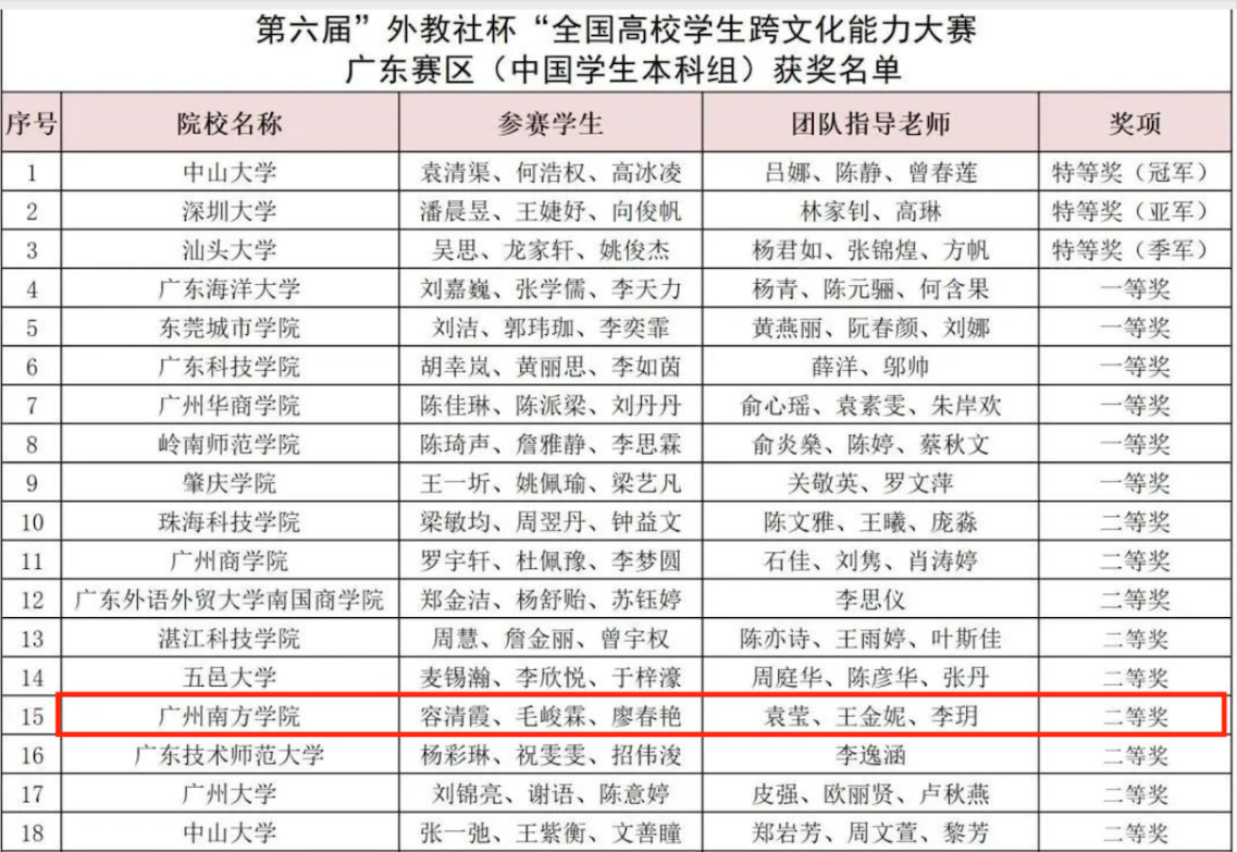 11月25日,第六届“外教社杯”全国高校学生跨文化能力大赛广东赛区决赛落下帷幕。我集团学生容清霞、毛峻霖和廖春艳在太阳集团tyc33455官网教师袁莹、王金妮和李玥的指导下,获得省级二等奖。