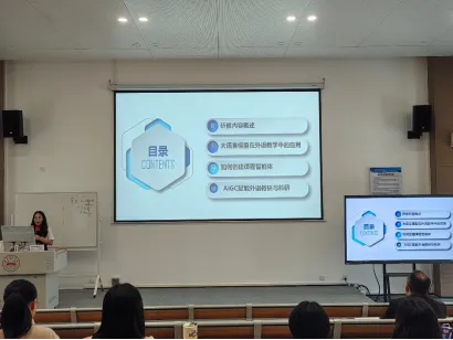 郭燕青老师对她们的研修内容做了简要的概述。她给在场的老师讲述了人工智能与外语教学的关联度,她用自身的认识以及教学经验为在场的老师讲解了AI对于赋能外语教学的作用和如何使用AI,让AI能够更好的融入课堂教学。