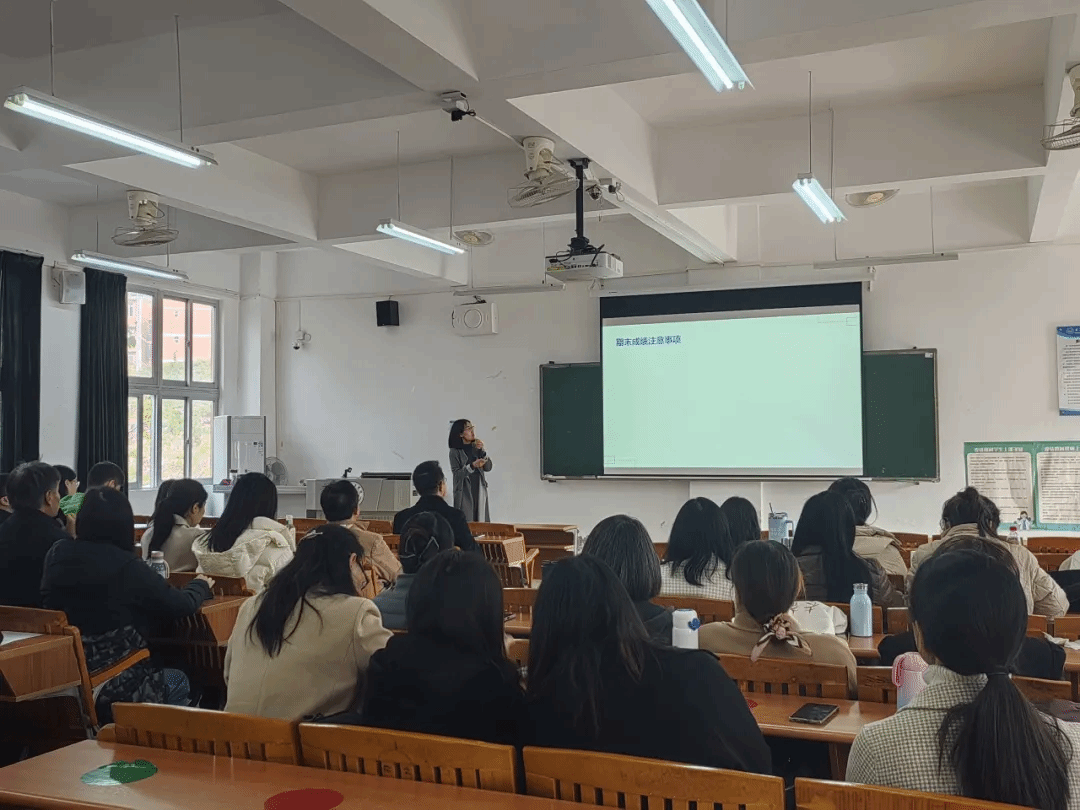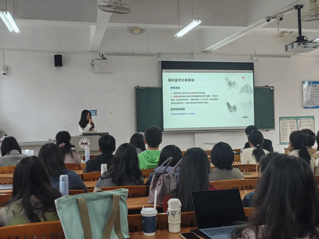 紧接着是彭倩老师进行期末监考注意事项讲话。提醒各位老师要严格按照监考流程进行,要留意考生的桌面有无与考试相关的物品,要清楚考试时间,做好考场规划,等其他事项。