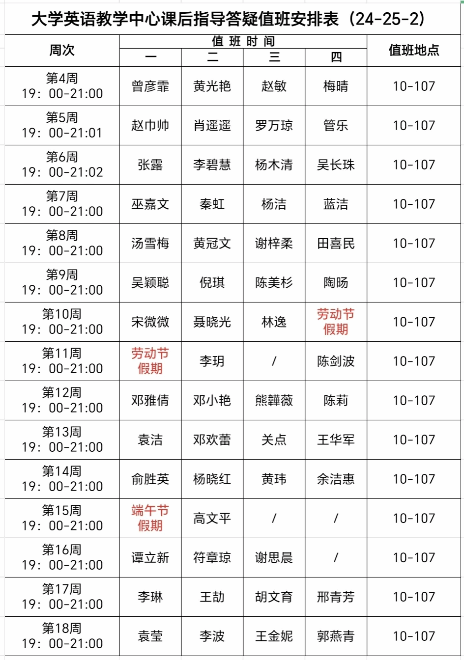 如同学们有英语课程、英语学科竞赛、考研、就业等的相关疑问,欢迎在值班时间内到10-107进行咨询。