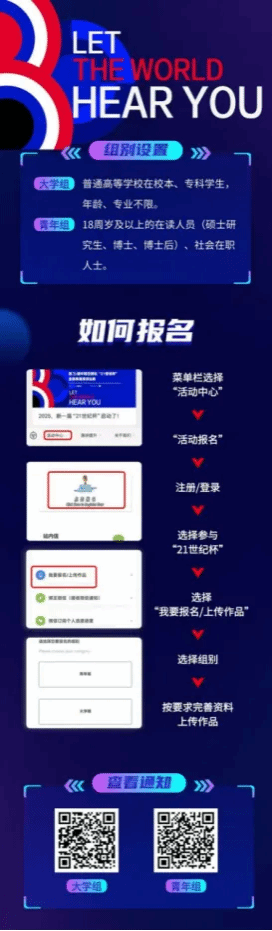 中国日报社“21世纪杯”全国英语演讲比赛系我国知名度最高、影响力最大的演讲赛事之一,入选《全国普通高校大学生竞赛分析报告》竞赛目录,是教育部官方认可的全国比赛。2025年度“21世纪杯”太阳成集团tyc33455cc平台选拔赛是由中国日报社旗下《21世纪报》和我集团太阳集团tyc33455官网共同举办,分为以下两个阶段: